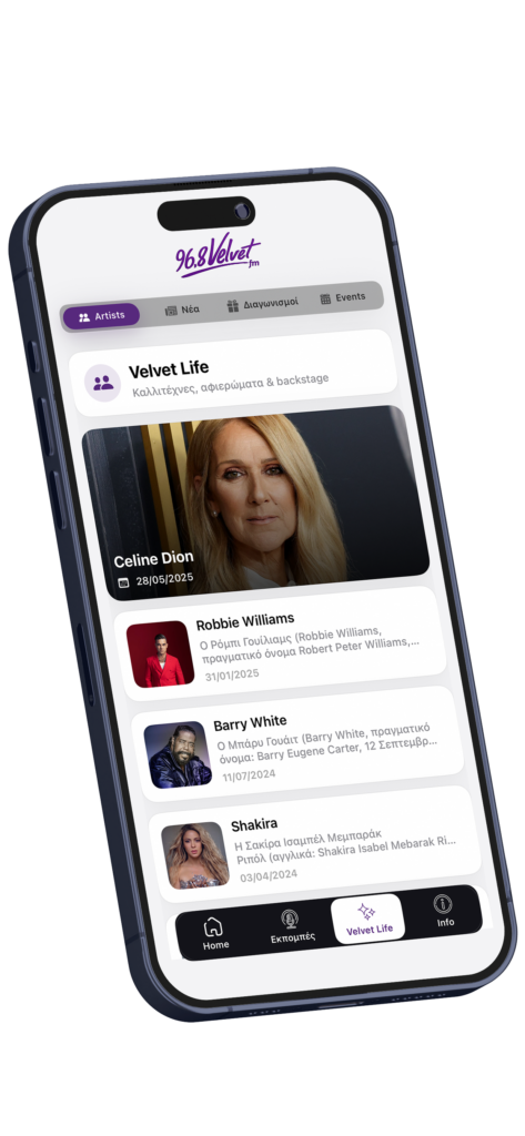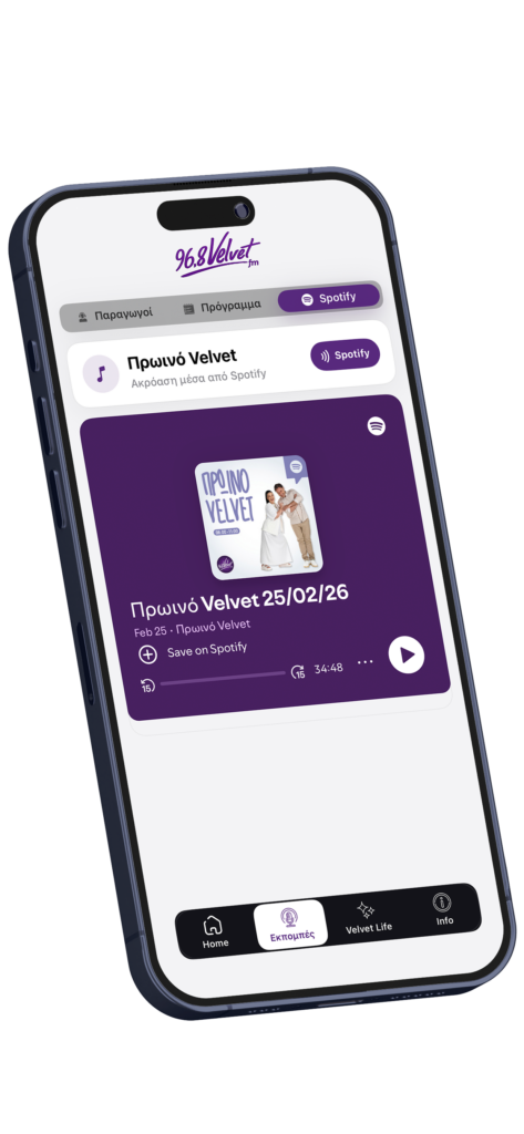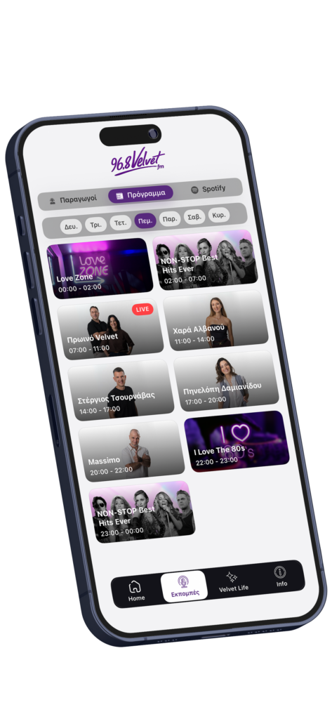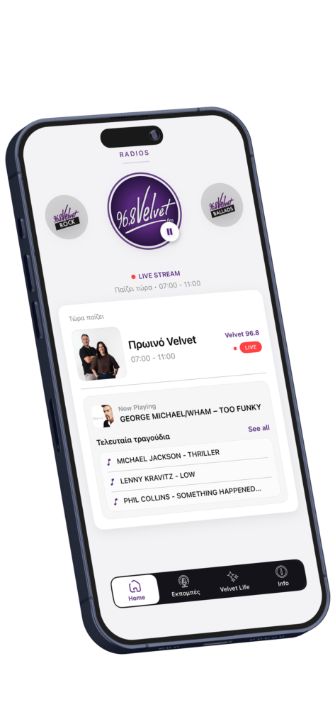 Η επίσημη mobile εφαρμογή του Velvet 96.8 προσφέρει άμεση πρόσβαση στο live πρόγραμμα του σταθμού, στους παραγωγούς και στο περιεχόμενο του Velvet μέσα από ένα σύγχρονο mobile περιβάλλον.